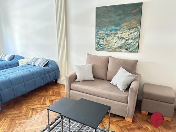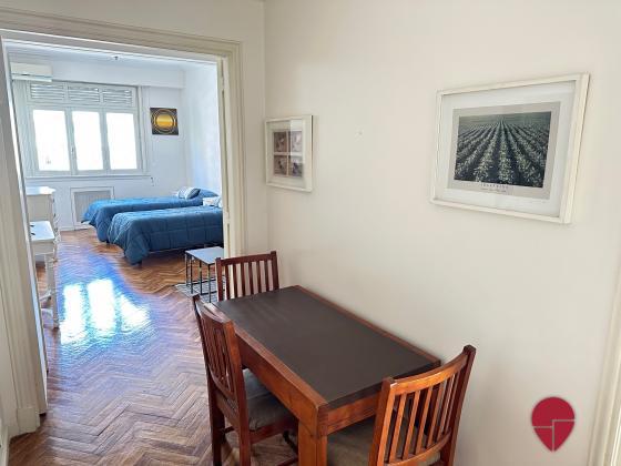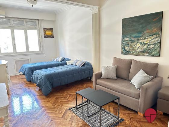 Muy lindo monoambiente en un clásico edificio de recoleta, muy bien ubicado a una cuadra de las avenidas Santa Fé y Calla, con acceso a múltiples medios de transporte y rodeado de comercios y restaurantes. Posee un hall de ingreso con una mesa de comedor y tres sillas. Amplio y luminoso ambiente con un sector de estar con sillón, mesa ratona y TV, y sector de dormitorio con una cama matrimonial o dos camas single según se requiera. Baño completo con bañadera. La cocina posee horno, heladera bajo mesada, microondas, y vajilla.