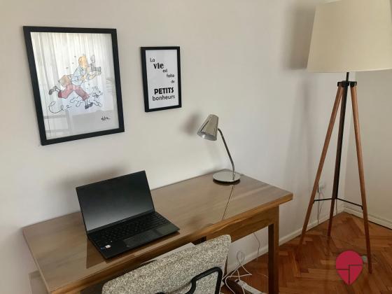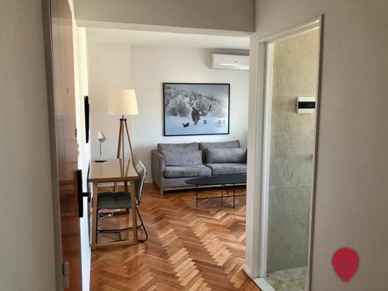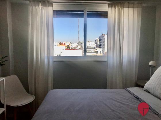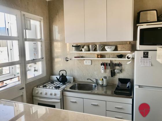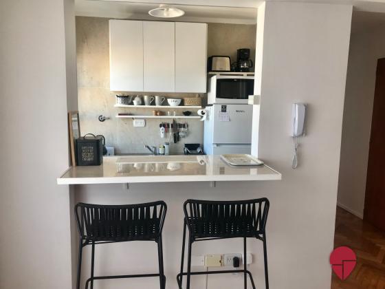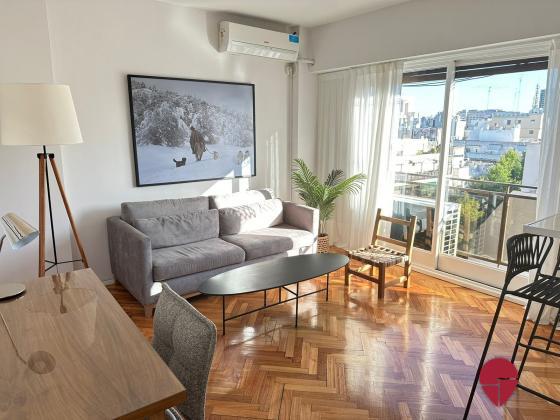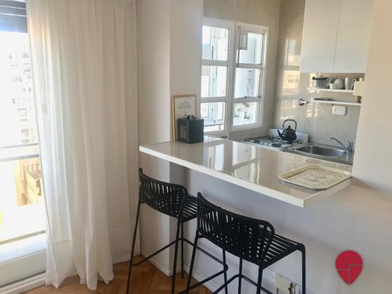 Impecable departamento de un dormitorio, pura luz con una vista abierta en todos los ambientes. Muy bien ubicado en recoleta, a una cuadra de Av. Pueyrredón, tres cuadras de las avenidas Santa Fe y las Heras, con acceso a muchos medios de transporte (línea H de subte a tres cuadras) y rodeado de bares y restaurantes. Piso alto muy silencioso y luminoso. Posee un living con salida al balcón, con un cómodo sillón y escritorio para trabajar o estudiar. La cocina está abierta con una barra y banquetas; está muy bien equipada con heladera, horno, microondas, cafetera, tostadora, y posee salida al balcón cerrado donde se encuentra el lavarropas. El dormitorio posee vista abierta con una cama matrimonial queen, TV, y muy amplios placares con baulera. El baño impecable posee bañadera y ventana.